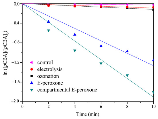 Figure 5 describes the HO• production in various processes. The degradation trends of pCBA are similar to those of PABA; the fastest reaction rate was detected in the compartmental E-peroxone process. As a famous HO• probe compound, pCBA has a high reactivity with HO• (kOH,pCBA = 5 × 109 M−1 s−1) and its ozonation rate is very low (kOH,O3 < 1 M−1 s−1) [24,32]. Therefore, the steady-state concentrations of HO• could be estimated from the slopes of curves in Figure 5, and their values were as follows: electrolysis (~3.0 × 10−14 mol/L) < ozonation (~3.9 × 10−14 mol/L) < E-peroxone (~4.2 × 10−13 mol/L) < compartmental E-peroxone (~6.4 × 10−13 mol/L).