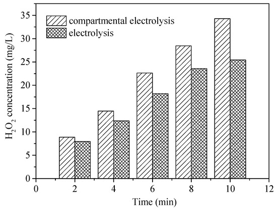 H2O2 generation in the electrolysis and compartmental electrolysis (cathode chamber) systems (O2 flow rate = 0.2 L/min; Applied current = 20 mA/cm2; Temperature = 25 ± 2 °C).