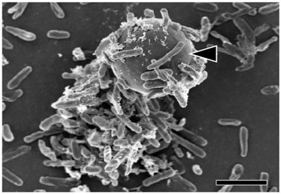 Scanning electron micrograph showing a Cryptosporidium oocyst (see [26] for methods). Scale bar = 3 μm.