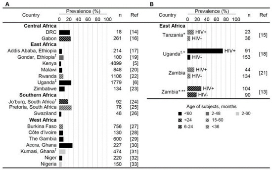 The prevalence of cryptosporidiosis in children is highly variable in sub-Saharan Africa and in certain sectors of the population. Figure 2 summarizes the prevalence of cryptosporidiosis in children under 5 years of age who visited health facilities with diarrhea [46,47].Although diagnosis is rarely made in this setting, coinfection with other enteric pathogens is common, with common exposure through poor sanitation and hygiene and as a result of immune predisposition due to HIV infection. In most sub-Saharan countries, the prevalence of cryptosporidiosis peaks in children aged 6–12 months and declines thereafter. It can be assumed that breast feeding provides a form of protection, by conferring immunoglobin or preventing water contamination [48]. This may explain why infection is delayed until after the age of 6 months, an age that is usually characterized by the onset of complementary feeding. Children are often infected throughout their childhood and adolescence, while their clinical impact reduces with age [48]. This is probably due to the development of immunity following repeated exposure to oocysts in the contaminated environment [49]. Experimental research shows that repeated exposure to Cryptosporidium parvum results in an IgG response that offers partial protection against subsequent infection and disease [50]. The extent to which this serological response protects against infection by other Cryptosporidium species is still unknown. Epidemiological scenarios that promote and exacerbate Cryptosporidium infections are mainly access to safe water, prevalence of HIV infections, and malnutrition [45,46,47].