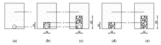 Schematic diagram of conventional, improved and filter subsurface drainage, (a) CD, (b) ID-1, (c) ID-2, (d) FD-1, (e) FD-2; Unit: mm. 1. Soil medium (80–120 mesh quartz sand); 2. Highly permeable materials (2–4 mm-diameter quartz sand); 3. Subsurface drainage pipe.