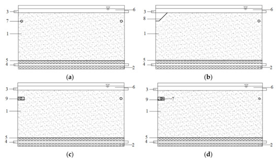 Structural planar graph of different combined drainage forms, (a) Conventional subsurface drainage, (b) Open-ditch and conventional subsurface drainage, (c) Filter and conventional subsurface drainage, (d) Improved and conventional subsurface drainage; Unit: mm. 1. Soil medium (80–120 mesh quartz sand); 2. Highly permeable materials (2–4 mm-diameter quartz sand); 3–4 Charging pipe; 5. Gauze; 6. Ponding water; 7. Conventional subsurface pipe; 8. Open ditch; 9. Filter body.
