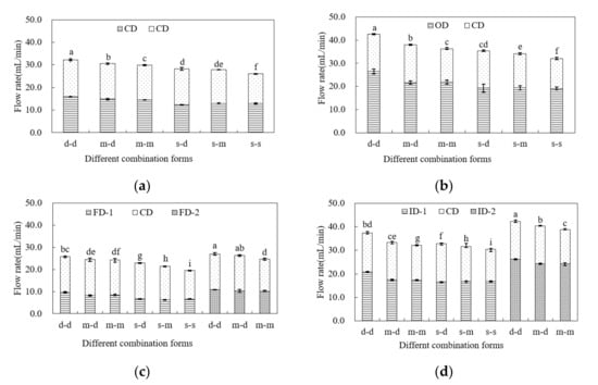 Flow rate of different combined drainage forms under a stable ponding water condition; (a) Conventional subsurface drainage; (b) Open-ditch and conventional subsurface drainage; (c) Filter and conventional subsurface drainage (d) Improved and conventional subsurface drainage. Note: Means followed by the same letter within a figure are not significantly different according to T-test (p < 0.05).