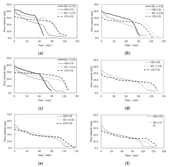 Flow-rate variation process over time; (a) Deep–deep combination; (b) Medium–deep combination; (c) Medium–medium combination; (d) Shallow–deep combination; (e) Shallow–medium combination; (f) Shallow–shallow combination.