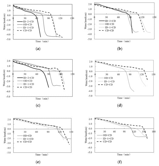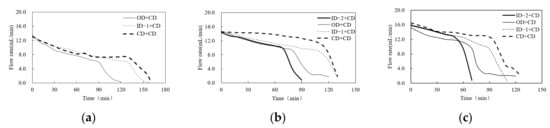 Figure 5 shows the variation in flow rate over time for different combined drainage forms under the receded water condition. Figure 6 shows the flow rate of the auxiliary, conventional subsurface drainage with various combined drainage forms under the same drain depth. The flow rate variation of the combined drainage forms have the same change characteristics as single drainage: the OD + CD has two periods of flow rate rapid change, and the flow rate of CD + CD, and ID + CD clearly decline when the ponding water will soon disappear. For the OD + CD, the total discharge into the open ditch decreased, owing to the influence of the position of the baffle. Under the condition of large flow rate, the flow rate rapidly decreased, owing to the disappearance of ponding water. Compared with the other combined drainage forms under the same drain depths (except the OD + CD combination), the ID-2 + CD combined drainage forms have the largest flow rate; this obviously brings forward the occurrence time of rapid flow attenuation. In the OD + CD and ID + CD, the flow rates of the auxiliary conventional subsurface drainage are close to the initial conditions, which is similar to the steady drainage case. Over time, both differences were not obvious at shallow depths. Under the combination of medium and deep depths, the CD + CD flow rate was larger than that of the OD + CD and ID + CD combination. This is mainly because the ponding water disappears earlier, and the flow rate decreases earlier in OD + CD and ID + CD. When the ponding water disappears, the flow rate of the open-ditch, conventional and improved subsurface drainage decreased rapidly in a short time.