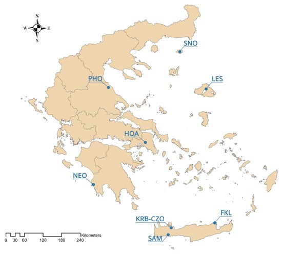 The first phase of LTER-Greece network (2016–2021) consists of eight observatories (Figure 1) encompassing the rich biogeographical variability of the country (www.lter-greece.gr, accessed on 3 May 2021):