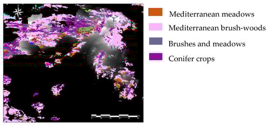 Figure 2. Classification of flammable material in the broader area (background DEM: Hellenic Cadastre). - (4)