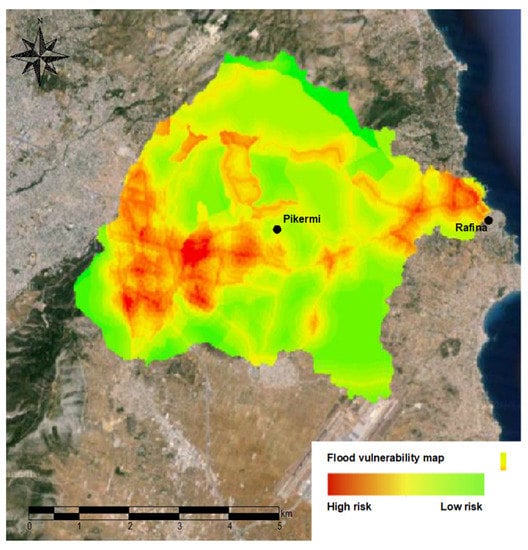 Figure 3. Flood vulnerability map. (Source: FLIRE DSS—http://www.flire.gr, accessed on 5 March 2021, background image: Google Earth).