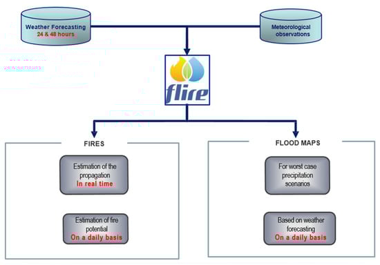 - Kochilakis, G.; Poursanidis, D.; Chrysoulakis, N.; Varella, V.; Kotroni, V.; Eftychidis, G.; Lagouvardos, K.; Papathanasiou, C.; Karavokyros, G.; Aivazoglou, M.; et al. A web based DSS for the management of floods and wildfires (FLIRE) in urban and periurban areas. Environ. Model. Softw. 2016, 86, 111–115. [Google Scholar] [CrossRef]