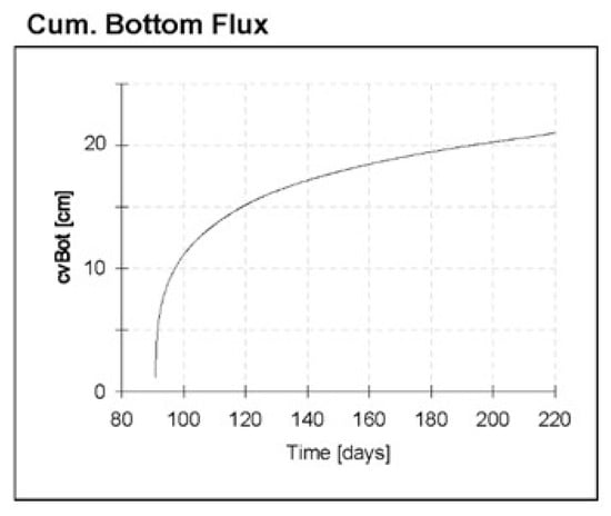 Despite the fact that sometimes it is neglected from soil water budget calculation, capillary rise can contribute significantly to crop water requirements, especially when a shallow groundwater table exists. HYDRUS-1D model was used to quantify the contribution of capillary rise to crop water requirements of five crops cultivated in Pinios Delta plain, central Greece. The model was executed for 75 different setups formulated by the five most representative soil profiles, three different groundwater table depths (1, 1.75 and 2.5 m below ground’s surface) and the five most representative crops of the study area, namely sunflower, corn, cotton, alfalfa and kiwi fruit. For all model runs, capillary rise was found to significantly increase soil water content of the rhizosphere, thus contributing to crop water needs. In the area, the contribution of capillary rise varied between 200 and 300 mm, while for the majority of model runs it was found to vary between 220 and 280 mm. Figure 5 presents cumulative capillary rise for corn cultivated in sandy loam (120 cm soil profile depth), sowed in early April and harvested in early August, while the groundwater table was assumed to be at 1.75 m depth. For this model run, capillary rise reached 211 mm for the whole growing season, while no deep-water percolation was observed. Model setup was based on exhaustive data collection and analysis and model runs do reliably reproduce water budget elements of the basin and explain and document the irrigation practices adopted by farmers in the basin, who effectively employ a Natural-Based Solution (NBS) system. The documented mechanisms have been accounted for in the proposed water resources management plans of the basin, in the framework of the AGROCLIMA GSRT project (water resources management of coastal agricultural environments, resilience of climate change impacts).