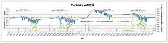 At the neighboring basin of Agia, irrigation needs are predominantly covered by groundwater abstracted from an aquifer system of limited extent and potential. To facilitate groundwater resources management and implement irrigation scheduling techniques, an Internet of Things (IoT) network of meteorological stations, soil moisture sensors and pressure transducers to measure groundwater fluctuations at production wells and water meters has been installed, amongst others, to sample at 10 min intervals. Apart from enabling accurate estimation of the aquifer system’s hydraulic parameters, data analysis allows study and understanding of the hydraulic evolution mechanisms, the impact of irrigation abstractions on groundwater reserves and the system’s response to and dependency on large hydrologic changes, such as those documented in the years 2017–2020 (Figure 6).