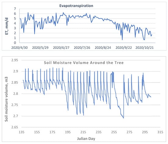 Evapotranspiration (ET) propagation and corresponding soil moisture profile responsive to ET and irrigation/precipitation events.