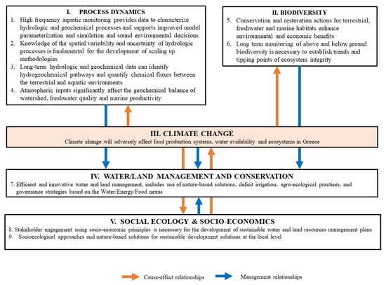 At the same time, the country is facing unprecedented socio-economic, e.g., [,,,] and environmental challenges, e.g., [,,,,,,]. The IPCC (2014) [] is projecting significant impacts in the region due to climate change. Water management, especially providing water for irrigation, will be a significant challenge in the future due to reduced precipitation and runoff, as well as increased frequency of droughts, including long-term epic droughts [,,]. Degraded soils due to agriculture and livestock grazing are under imminent threat of desertification (including soil carbon loss). Mitigation of extreme events, together with reversing the trends of biodiversity loss, habitat fragmentation, aquatic quality deterioration and overfishing, complement the puzzle of environmental management that needs to be solved in the next few decades, in order to prevent catastrophic environmental degradation in Greece. Within this frame, the LTER-Greece was established in order to contribute to science-based solutions for such challenges.