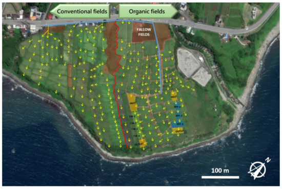 Fields situation of the study site in Xinshe village, Fengbin Township, Hualien County, Taiwan. The yellow arrows show the runoff direction, the blue line shows an irrigation pipe, and the red line shows the boundary of organic fields and conventional fields. Treatments applied are also shown in the figure.