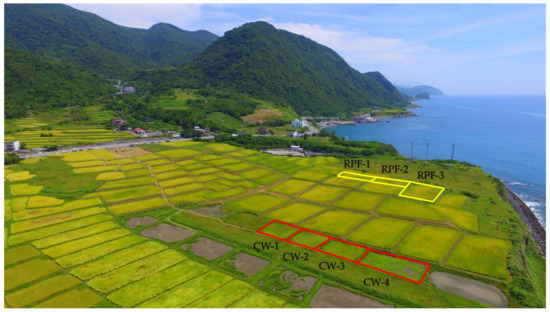 The study site in this research is located in Xinshe village, Fengbin Township, Hualien County, Taiwan (23.654, 121.539), which is called “Xinshe peninsula” by local people. There are about 2 × 105 m2 rice paddy fields in the area, and half of it is organic rice plantation and another half of it is for conventional rice. There is only one crop season due to the northeast monsoon from October to March next year. Besides, there is no irrigation drainage system here, the irrigation water overflows from upper fields to the lower ones. At the end of the “Xinshe peninsula”, the irrigation water discharges to the Pacific Ocean. There are abundant fishery resources and coral reefs under the sea level close to the terrestrial area.