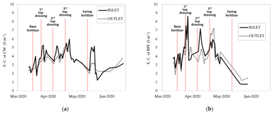 E.C. of INLET and OUTLET in (a) CW treatment and (b) RPF treatment of first crop season, 2020 (March–June); each fertilization timing is marked.