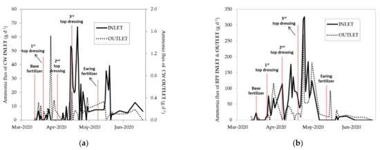 Ammonia fluxes of INLET and OUTLET in (a) CW treatment and (b) RPF treatment of the first crop season, 2020 (March–June); each fertilization timing is marked.