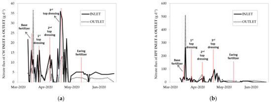 The average concentrations, maximum and minimum concentrations of nitrate were measured from the inlet and outlet in both treatments. The average concentration of nitrate of the inlet in CW treatment was 0.19 ± 0.21 mg L−1, ranging from 0 to 0.91 mg L−1, and was 0.22 ± 0.34 mg L−1 for the outlet, ranging from 0 to 2.13 mg L−1. In the RPF treatment, the average concentration of nitrate of the inlet was 0.30 ± 0.51 mg L−1, ranging from 0 to 3.07 mg L−1, and was 0.33 ± 0.86 mg L−1 for the outlet, ranging from 0 to 5.90 mg L−1. The results are shown in Table 3. The nitrate fluxes of the inlet and outlet during the study period are shown in Figure 5. The average nitrate removal efficiency of the whole crop season was 42.7% in the CW treatment and was −51.3% in the RPF treatment. After each fertilization, the nitrate fluxes increased and then decreased in both treatments.