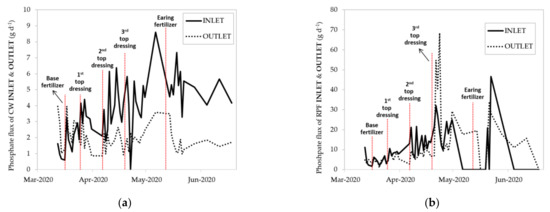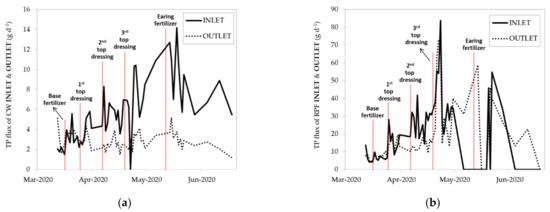 Total phosphorous fluxes of INLET and OUTLET in (a) CW treatment and (b) RPF treatment of the first crop season, 2020 (March–June); each fertilization timing is marked.