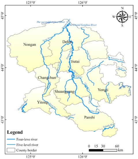 Yinma River is the largest tributary of the Second Songhua River, and it is located in the southeast of Laoye Ling, Diyuanzi Township, Yitong County, which is situated in the central part of Jilin Province [28]. This river originates from Hulanling, Yima Town, flows through Panshi City, Shuangyang, Yongji, Jiutai, Dehui, and Nong’an, that is, six districts and counties, to the confluence of Kaoshan Town, Nong’an County, and the Yitong River, flowing nearly 20 km north into the Songhua River, with a total length of 386.8 km and a watershed area of approximately 16,000 km2 (including the Yitong River) [29]. The distribution map of the Yinma River Basin is shown in Figure 1. The river is located in the core area of the black soil belt in northeast China. It is the main production area of grains such as corn and rice, which makes it the main commercial grain production region in China. The river flows through the Shitoukoumen and Xinlicheng Reservoirs, providing water for domestic purposes in the urban region of Changchun and for domestic purposes, agricultural irrigation, and fish farming in the surrounding areas. The basin has a typical continental monsoon climate in the north temperate zone; the average annual rainfall in this region is far less than the rate of evaporation, and it is mainly concentrated in the summer [30,31]. The uneven distribution of water resources in the Yinma River Basin affects the residents in the region and restricts local economic development.