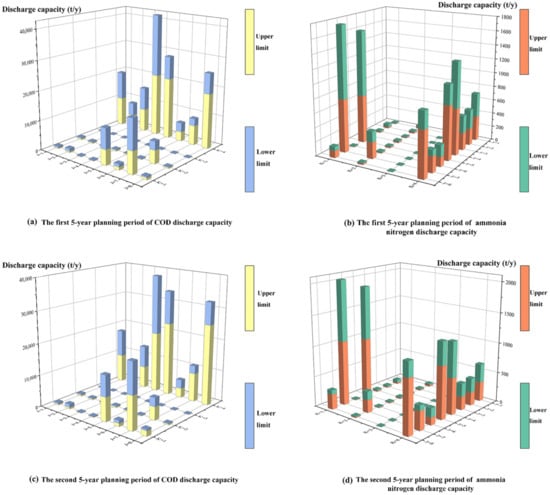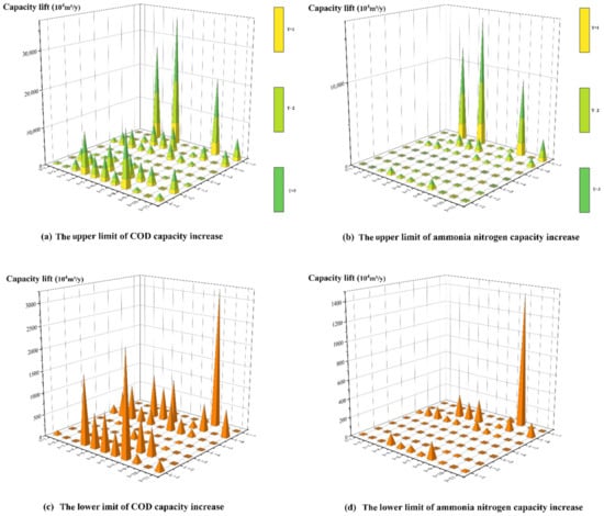 COD and ammonia nitrogen capacity increase at each control section in the Yinma River Basin.(a) The upper limit of COD capacity increase at each control section in the Yinma River Basin (b) The upper limit of ammonia nitrogen capacity increase at each control section in the Yinma River Basin (c) The lower limit of COD capacity increase at each control section in the Yinma River Basin (d) The lower limit of ammonia nitrogen capacity increase at each control section in the Yinma River Basin.