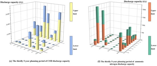 COD and ammonia emissions by water-use sectors in the Yinma River Basin for different planning periods. (a) The first 5-year planning period of COD discharge capacity by water-use sectors in the Yinma River Basin (b) The first 5-year planning period of ammonia emissions discharge capacity by water-use sectors in the Yinma River Basin (c) The second 5-year planning period of COD discharge capacity by water-use sectors in the Yinma River Basin (d) The second 5-year planning period of second ammonia emissions discharge capacity by water-use sectors in the Yinma River Basin (e) The third 5-year planning period of COD discharge capacity by water-use sectors in the Yinma River Basin (f) The third 5-year planning period of ammonia emissions discharge capacity by water-use sectors in the Yinma River Basin.