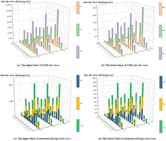 An analysis of the typical pollutant input provides a clearer and more intuitive understanding of the flow availability of different pollutant types at each section of the Yinma River Basin at low-, medium-, and high-flow levels, as well as the river input during different planning periods. It also provides a clearer and more rational optimization plan for decision makers. Figure 2 depicts the amount of COD and ammonia discharge emissions into the river at each control section in the Yinma River Basin.