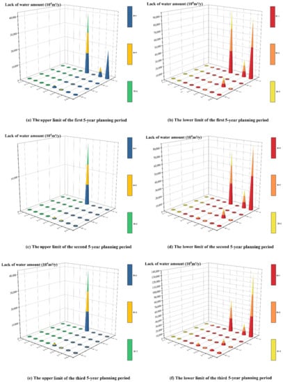 As shown in Table 3, Changchun, being the capital city, has a relatively prominent issue of water demand. To aid water conservation efforts, Changchun can act to alleviate the deficit of freshwater resources. In view of the conspicuous problem of water deficits in large- and medium-sized cities, measures such as water resource reuse should be taken in the industrial and ecological water consumption sectors. Water deficit situations of different water sectors in various planning periods and areas can be significantly alleviated by employing these measures to adapt to the specific planning period and to urban development. In Changchun area, after optimized allocation of industrial sectors and ecological environment sectors, the water reuse increased yearly from [4163.79, 4733.79] × 104 m3/year in the first five-year planning period to [5011.12, 6990.57] × 104 m3/year in the second five-year planning period. Finally, the third five-year planning period reached [5877.48, 6330.24] × 104 m3/year, far exceeding the total water consumption of ecological environment sectors in other planning areas in the same planning period ([2071.04, 2371.18] × 104 m3/year, [2343.67, 2946.15] × 104 m3/year, and [2671.33, 3449.09] × 104 m3/year). In recent years, China has focused on solving its ecological and environmental problems, with a simultaneous increase in industrial water consumption. In view of the particularity of ecological and environmental water consumption, the reuse of water resource is a good response measure to solve water resource deficit issues. This is especially relevant to areas with relative water shortages and an excessive demand for water resources.