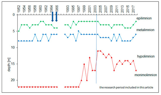 Figure 2. The range of thermal layers in the peak summer stagnation period (August) during the whole observation time. The research period included in this article is shown on the right-hand side. The blue arrows show the aluminium sulphate treatment.