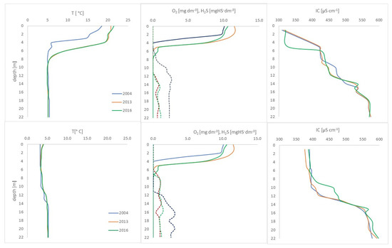 Figure 3. Examples of the vertical thermal profile, the oxygen and hydrogen sulphide (dot line) concentrations, and conductivity in Lake Starodworskie in August (upper panel) and December (lower panel).