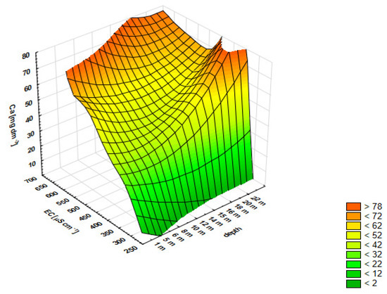 Figure 4. The vertical profile of calcium concentration in Lake Starodworskie according to conductivity. The legend shows the calcium concentration.