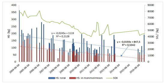 The monimolimnion accumulated the majority of gases produced in the lake. At the beginning of the study period, this layer accumulated 85–90% of total hydrogen sulphide (123–327.5 kg HS−2) (Figure 5) and approximately 80% of total carbon dioxide (1888.7–1916.6 kg CO2). In 2016, the aforementioned loads decreased to 67.2–189.3 kg HS (27–69.9%) and 1242.2–1314 kg CO2 (30.5–40%), respectively. The predominant ions were calcium (52.1 mg dm−3 on average), magnesium (7.37 mg dm−3 on average), and sulphates (9.04 mg dm−3 on average). During the entire study period, nearly half the total ammonia nitrogen (max. 671.7 kg) and total phosphorus (98.2 kg) were accumulated in the monimolimnion, whereas the phosphate content exceeded 60% (68.1 kg) (Table 3).