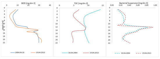 Figure 6. Vertical profiles showing changes in organic matter concentration defined as BOD5, TOC, and bacterial suspension.