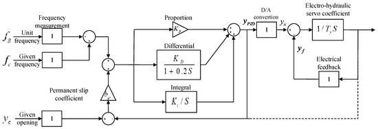 The hydraulic speed control system consists of the PID control system and the hydro-mechanical system. The PID control system belongs to a linear controller, which forms a control deviation between the reference value and the output value on the basis of the proportional-integral-differential loop to enable the frequency regulation [37,38]. Generally, the mechanism of the PID control system [39] is expressed as: