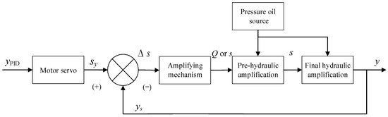 The hydro-mechanical system governs the hydraulic servomotor, which essentially belongs to an integral loop. The regulating performance of the hydro-mechanical system is described by the start time and stop time of the hydraulic servomotor. A conventional hydro-mechanical system is expressed by the transfer functions, as shown in Figure 2.