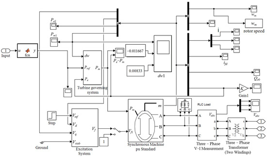 Therefore, based on the above considerations, the block diagram of the hydropower generation system is finally established based on MATLAB/Simulink, as shown in Figure 3.