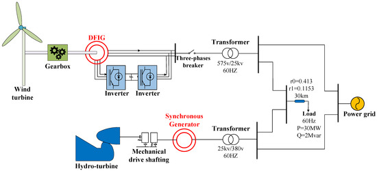 In this section, the wind–hydropower integrated power system is presented by MATLAB/Simulink. The established model is used to extensively investigate how the hydropower generation system benefits the grid power stability under the fluctuation of wind power. Herein, the hydropower model employs the typical IEEE model presented in 1992, and the wind power model is based on the double-fed induction generator (DFIG).