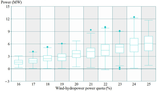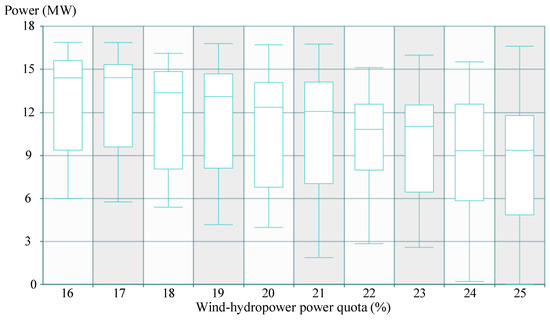 From Figure 13, the average output of the hydropower shows a decreasing trend, because its mid-value significantly declines from 14.1 MW to 9.3 MW with the increase of wind-hydropower quota. This can be explained by the suppressing effect of the hydropower on the injection of the increasing wind power. The hydropower difference between the upper quartile and lower quartile maintains a relatively large interval in this case, i.e., around (4.6 MW, 7 MW), implying that the guide vane should be frequently regulated to balance the wind power fluctuation. This easily leads to the fatigue damage of the guide vane and further causes economic loss to the power station. Moreover, with the increase of renewable energy participation, maximum hydropower (about 16.6 MW) occurs at 25% wind–hydropower quota. This is due to the increasing capacity contribution of the hydropower system.