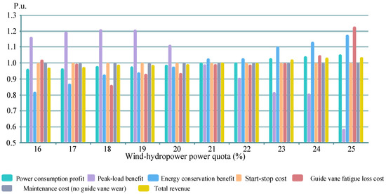- The power consumption profit and energy conservation profit increase with the wind-hydropower quota, increasing from 16% to 25%, while the guide vane fatigue loss coast shows a fluctuating trend. The total revenue shows an increasing tendency as a whole, which increases about RMB 928.62 million with the quota from 16% to 25%.