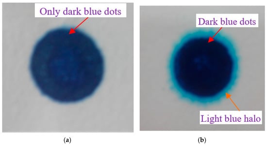 (3) If only a blue dot appears on the filter paper (Figure 1a), step (2) was repeated. When a stable blue halo (Figure 1b), with a width of about 1 mm and surrounding the dark blue part, appears on the filter paper, we stopped dripping when the blue halo had remained for 5 min (indicating that the soil sample has absorbed methylene blue molecules to saturation) and finally recorded the total volume of added methylene blue solution, completing the test procedure.