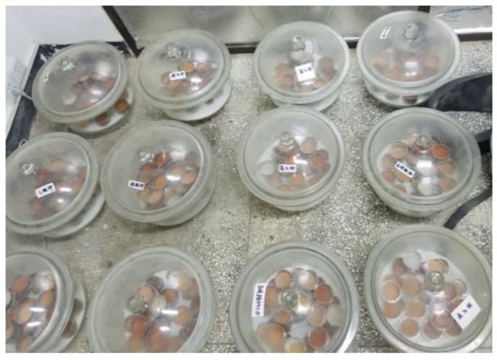 (1) Twelve saturated salt solutions representing different relative humidities were prepared in a constant-temperature environment (T = 20 °C), as shown in Table 3 []. Then, the configured salt solutions were poured into 12 desiccators, the edge of the lid of each desiccator was sealed with petroleum jelly, and the humidity of the environment inside the desiccator was left to equilibrate for more than 10 days. When solid salt precipitated from the solution had formed, the solution was considered be saturated []. The humidity of the environment, with RH = 100%, was controlled using distilled water.