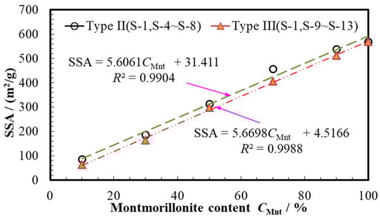 The SSA experimental results of the soil samples determined by the methylene blue method are shown in Table 4. It can be seen that from Table 4 that for type I clay samples of a single mineral (S-1~S-3), montmorillonite (SSAS-1 = 569.05 m2/g) had the largest specific surface area, followed by kaolinite (SSAS-2 = 20.64 m2/g), and potassium feldspar had (SSAS-3 = 4.28 m2/g) the smallest. For both types of mixed clayey soil samples (Types II and III), the specific surface area (SSA) increased linearly with montmorillonite content (CMnt.) increasing, which is shown as Figure 3. The reason is that montmorillonite has a 2:1 crystal structure with interlayer domains between adjacent crystal layers, into which water and other polar molecules can enter, and therefore it has both a large internal and external specific surface area. Kaolinite has a 1:1 crystal structure with no interlayer domains between crystal layers, and kaolinite only has an external specific surface area, and therefore its specific surface area is relatively low. Potassium feldspar is a non-clay mineral, and its specific surface area is even lower, compared with clay minerals. As a result, the total specific surface area of both mixes increases linearly as the montmorillonite content increases; both montmorillonite and kaolinite are clay minerals, so the specific surface area of both clay mineral mixes (Type II) is significantly higher than that of the montmorillonite (clay mineral) + potassium feldspar (non-clay mineral) mixes (Type III) under the same conditions.