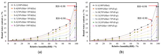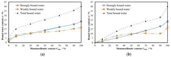 It can be seen in Figure 5 that the higher the montmorillonite content, the higher the amount of bound water adsorbed by the mixed clayey soils. For the mixture of montmorillonite + kaolinite (Figure 5a), the amounts of adsorbed bound water (total bound water, strongly bound water and weakly bound water) all increase rapidly in montmorillonite-content ranges of 0–10%; while, when montmorillonite content exceeded 10%, the amounts of adsorbed bound water all increased slowly. For the mixture of montmorillonite + feldspar (Figure 5b), total bound water and weakly bound water both increased rapidly, in the range of 0–30%; whereas, when montmorillonite content was in the range of 30–90%, the total bound water and weakly bound water both increased slowly; and, when montmorillonite content exceeded 90%, the total bound water and weakly bound water both increased rapidly again. However, the strongly bound water increased linearly with montmorillonite content (CMnt.) over all RHs.
