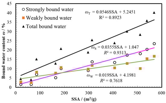 Figure 6 shows the relationship between the bound water and the specific surface areas (SSA) of the mixed soils. It can be seen from Figure 6 that the adsorbed bound water of the mixed clay tends to increase linearly with SSA. Specially, strongly bound water had the highest linear correlation with specific surface area (R2 = 0.9313), followed by total bound water (R2 = 0.8923), and the weakly bound water had the lowest (R2 = 0.7618). The above variation pattern can be explained in terms of clay mineralogy []: clay minerals are generally flat and have hydration-activation centers, which can adsorb bound water under various effects such as hydrogen-bonding connection, the electrostatic gravitational force, the van der Waals force, and osmotic adsorption. According to the action of the above forces, adsorbed bound water is categorized as strongly bound, weakly bound or free water depending on their distance from clay particles, which are taken to be the center, as shown in Figure 7. Generally speaking, strongly bound water is generally closely adsorbed on the surface of clay particles by hydrogen bonding, which belongs to the solid phase category and is most significantly affected by the specific surface area of clay particles. Weakly bound water is generally adsorbed in the outer layer of strongly bound water by the van der Waals force within the diffusion layer of the double-electric layer, and is significantly weakened by the specific surface area of clay particles, due to its distance from clay particles and the influence of various other forces.