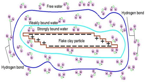 Clay minerals are the main components of clayey soil, which adsorb bound water because of their hydration-activation centers. Bound water is one of the important factors in controlling the multiple physical and chemical properties of clay, including consistence, plasticity, dispersion, expansion, and shrinkage [,,,,,,]. It is very meaningful to quantify the boundaries between different types of bound water in clays. The quantified boundaries help to predict the physical–chemical processes that occur after clay minerals are combined with water, and control the special physical, chemical, and mechanical properties of hydrated clay. It plays an important role in geotechnical engineering disaster prevention and environmental protection [,].
