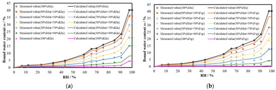 The above-mentioned analysis indicates that the amount of bound water in mixed clayey soils is closely related to two influencing factors—the mineral composition of the clay (montmorillonite content CMnt.) and specific surface area (SSA). In fact, the specific surface area (SSA) of a mixed clayey soil is linearly related to its montmorillonite content CMnt., shown in Figure 3. Therefore, the amount of adsorptive bound water in the mixed clayey soils is essentially attributed to its mineral composition (montmorillonite content). The two types of mixed clayey soils studied in this paper were combinations of two minerals (i.e., Type II: montmorillonite + kaolinite and Type III: montmorillonite + feldspar), so the adsorptive bound water of the mixed clayey soils can be calculated by proportionally superimposing the adsorptive bound water of each mineral and at each moisture level, following from Equations (2) and (3). Thus, superimposed adsorption isotherms were formed, as shown in Figure 8.