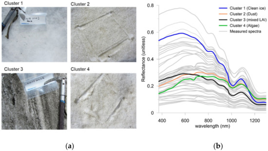 - Takeuchi, N. Temporal and spatial variations in spectral reflectance and characteristics of surface dust on Gulkana Glacier, Alaska Range. J. Glaciol. 2009, 55, 701–709. [Google Scholar] [CrossRef] [Green Version]
