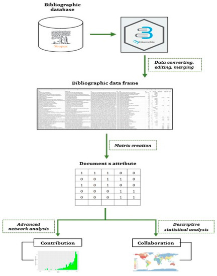 According to Aria and Cuccurullo [44], this open-source tool can be used for a comprehensive mapping analysis of scientific studies. The first step was data collection; in this step, only articles from SCOPUS (https://www.scopus.com/search/form.uri?display=basic#basic, accessed on 25 September 2020) were utilised. The uploaded data were converted from a CSV file to a data frame using bibliometrix. Then, this data frame was converted into a matrix, the specificities of which depended on the attribute selected. With the matrix created, data visualisation was possible in two ways: for contributions per year following a network analysis of the research production per country, or for collaborations between countries using statistical analysis.
