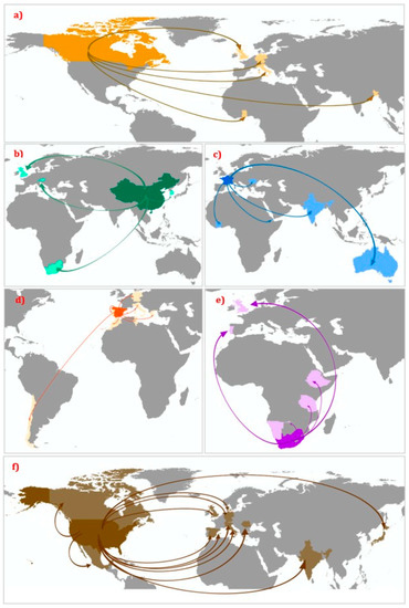 Countries with the highest levels of collaboration between 1980 and 2020. (a) Collaborations between Canada and Bangladesh, Germany, Ghana, Italy and the United Kingdom. (b) Collaborations between China and Austria, Korea, South Africa and the United Kingdom. (c) Collaborations between France and Australia, Cote D’Ivoire, Djibouti, India and Romania. (d) Collaborations between Spain and Chile, Germany, Greece, Italy, Morocco, Portugal and Tunisia. (e) Collaborations between South Africa and the United States, Ethiopia, Namibia, Portugal, Tanzania and the United Kingdom. (f) Collaborations between the United States and Canada, Denmark, Germany, India, Italy, Japan, Mexico, Monaco, Romania, Spain, Switzerland, and the United Kingdom.