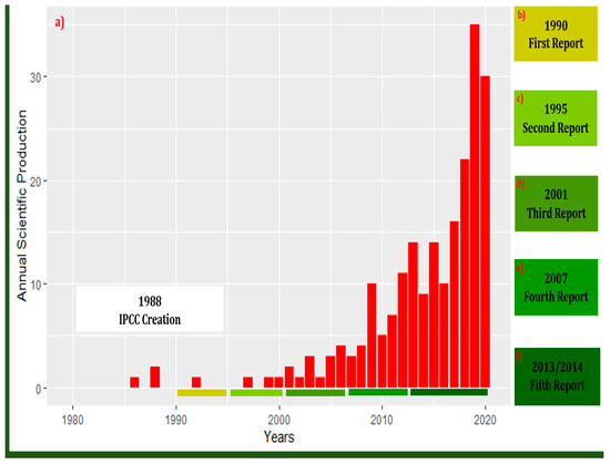 In this decade, the most crucial international program in the evaluation of scientific knowledge related to climate change was created. The creation of the Intergovernmental Panel on Climate Change (IPCC) in 1988 opened the doors for studies and essential information about the effects of climate change on hydrogeological resources. The first report was published in 1991 and integrated four scenarios (A, B, C and D) according to carbon dioxide concentrations. In this first report, scenario A presented a case with few or no measures to curb emissions, while the other three scenarios were based on increasing control levels. In 1992, the United Nations held the Conference on Environment and Development in Rio de Janeiro where the IPCC presented six more scenarios (IS92a–f), considering future greenhouse gas and aerosol precursor emissions based on assumptions concerning population and economic growth, land use, technological changes, energy availability and fuel mix during the period between 1990 and 2100. The Second Assessment Report was presented in 1995 and the third IPCC assessment report in 2001, showing four new scenarios (A1, A2, B1 and B2) that were used to simulate the future of groundwater according to the different scenarios for the weather. These scenarios were classified following the next criteria. Scenario A1 considered the rapid economic growth, high population growth by 2050, and efficient technologies. Scenarios A2 describes a very heterogeneous world based on self-sufficiency and conservation, continuous population growth, and slow technological evolution. Scenario B1 considers the rapid population growth by 2050, but with an economy based on services and information. Introduction of clean technologies with practical resources, green economy, natural resource management and climate sustainability. Scenario B2 is based on slow population growth and economic, social, and environmental sustainability. In 2007, the IPCC presented a fourth report, moving from the previous scenarios to Representative Concentration Pathways (RCPs). In 2014, the penultimate report was published, resulting in an increase in studies from all parts of the globe. Figure 5 illustrates the yearly scientific production for the four decades from 1980 to 2020.